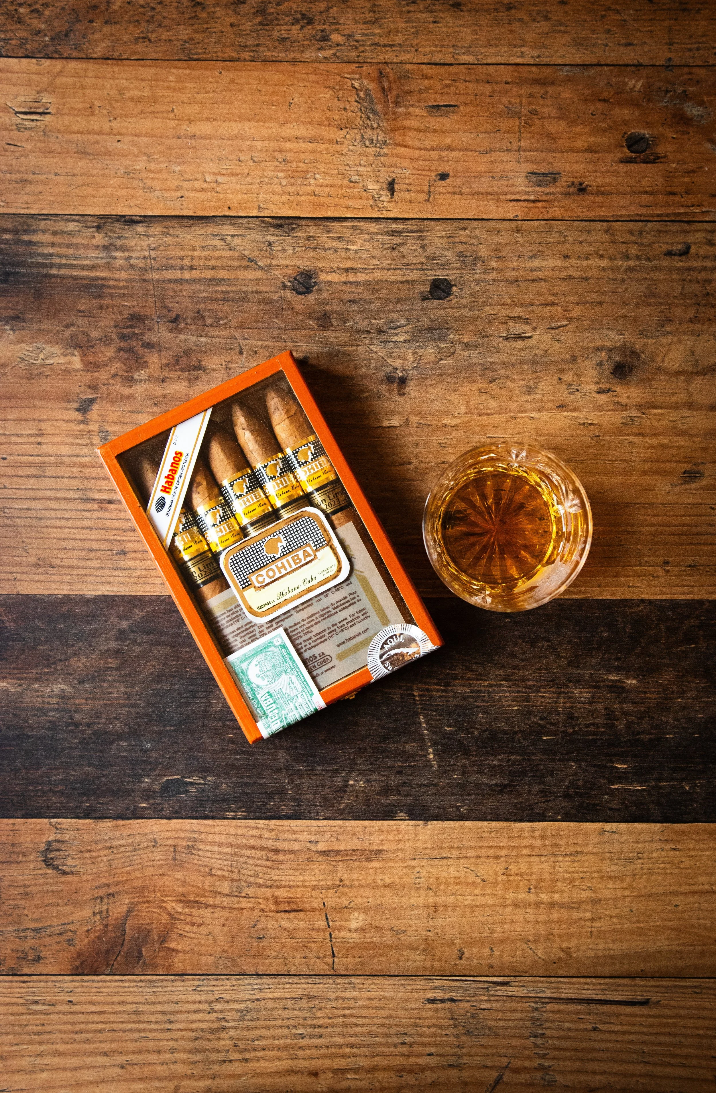 Cigar pack labeled 'Cohiba' and a glass of amber-colored liquid on a wooden surface.
